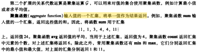 - 扩展关系代数运算可以实现一些使用基本关系代数运算和附加关系代数运算无法实现的功能,包括去重(𝛿)、广义投影(Π)、聚集(𝒢)、分组(𝒢)、排序(𝜏)等