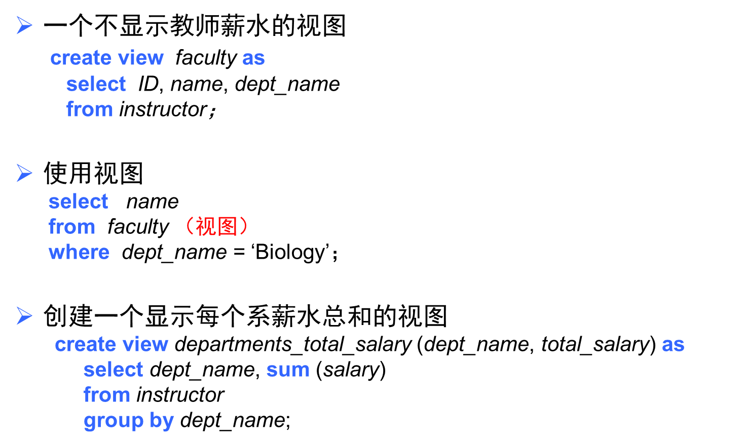 - "(dept_name, total_salary)" 告诉数据库系统,在创建名为 "departments_total_salary" 的视图时,这个视图将包含两列,分别命名为 "dept_name" 和 "total_salary"。