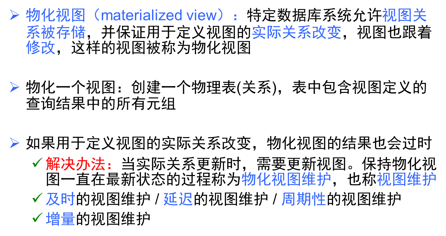 物化视图:如果用于定义视图的实际关系改变,视图也会跟着修改。