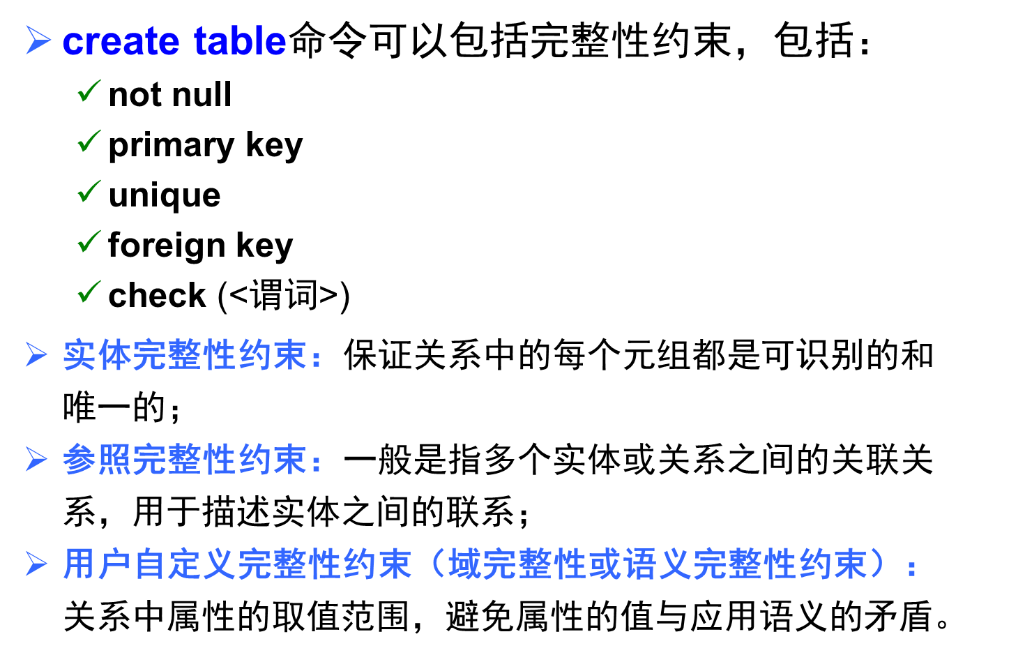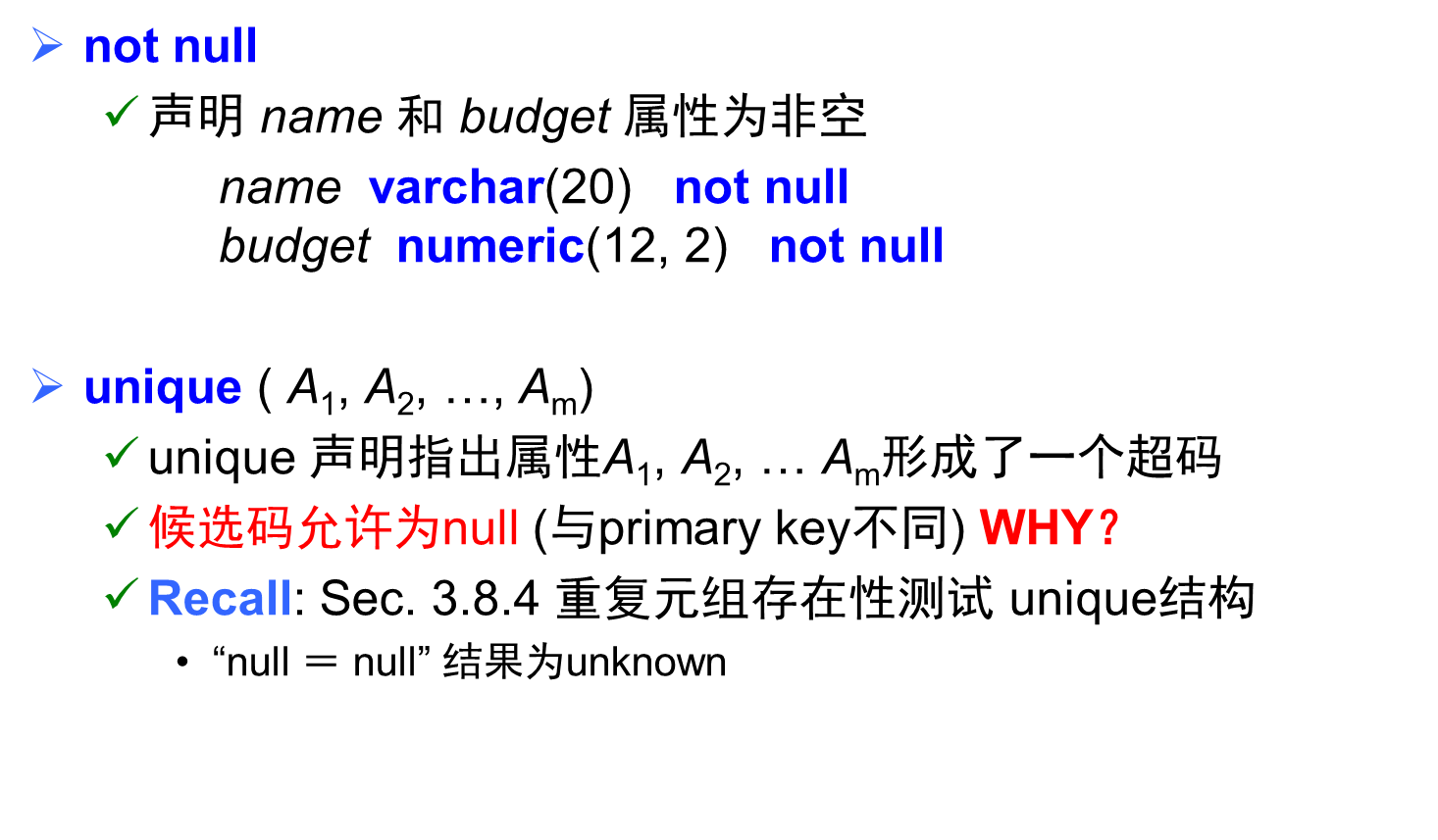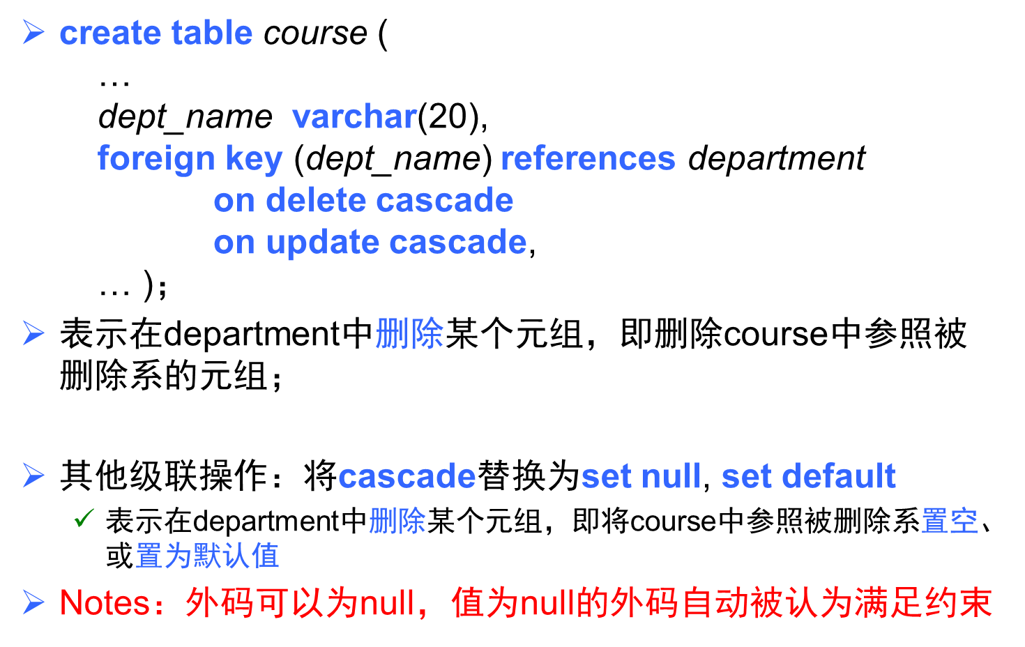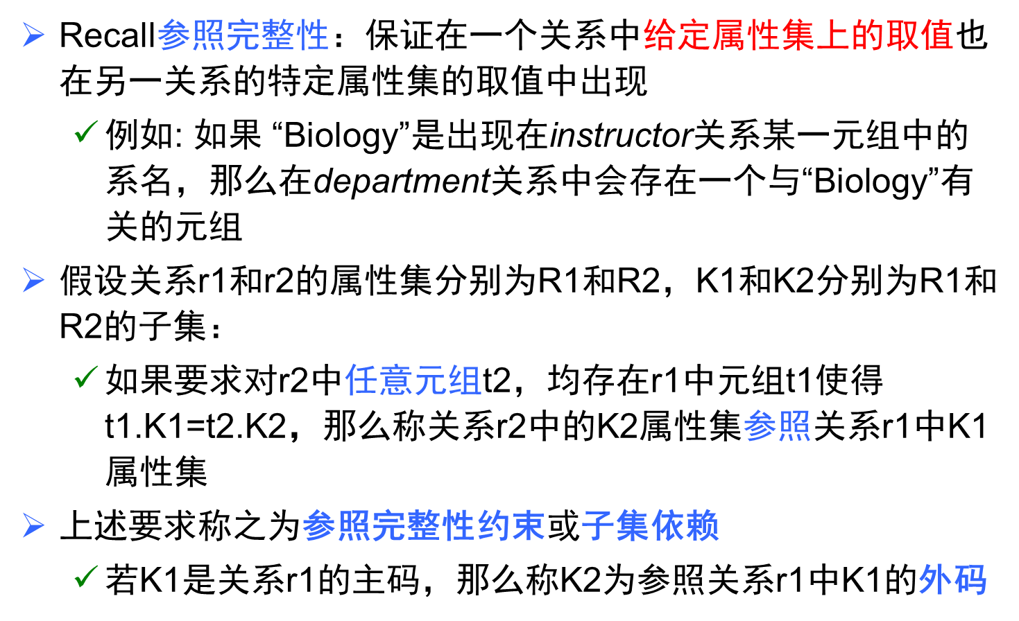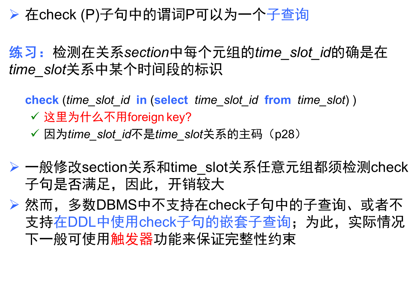 示例:对于student关系中的每个元组,它在属性tot_cred上的取值必须等于该生所成功修完课程的学分总和 (p78)